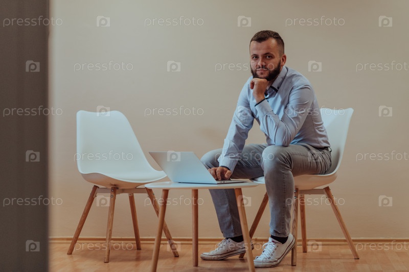 Уверенный в себе бизнесмен сидит и использует ноутбук с решительным выражением лица, а бежевый фон усиливает профессиональную атмосферу, демонстрируя его производительность и опыт