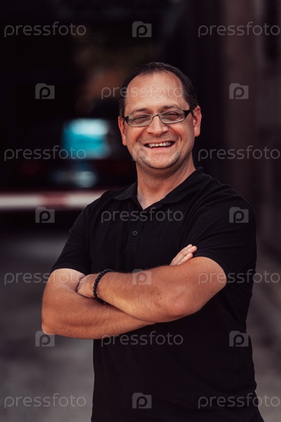 Успешный бизнесмен позирует на открытом воздухе, скрестив руки на груди