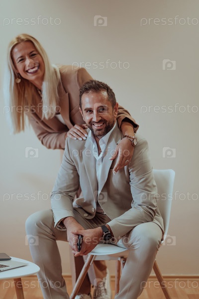 Пара бизнесменов позирует для совместной фотографии на бежевом фоне, запечатлевая свое профессиональное партнерство и создавая вневременной образ единства и успеха