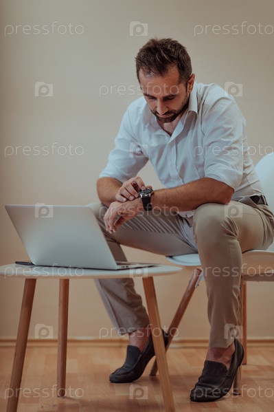 Уверенный в себе бизнесмен сидит с решительным выражением лица, используя ноутбук и смарт-часы, а бежевый фон подчеркивает профессиональную атмосферу, демонстрируя его производительность и опыт