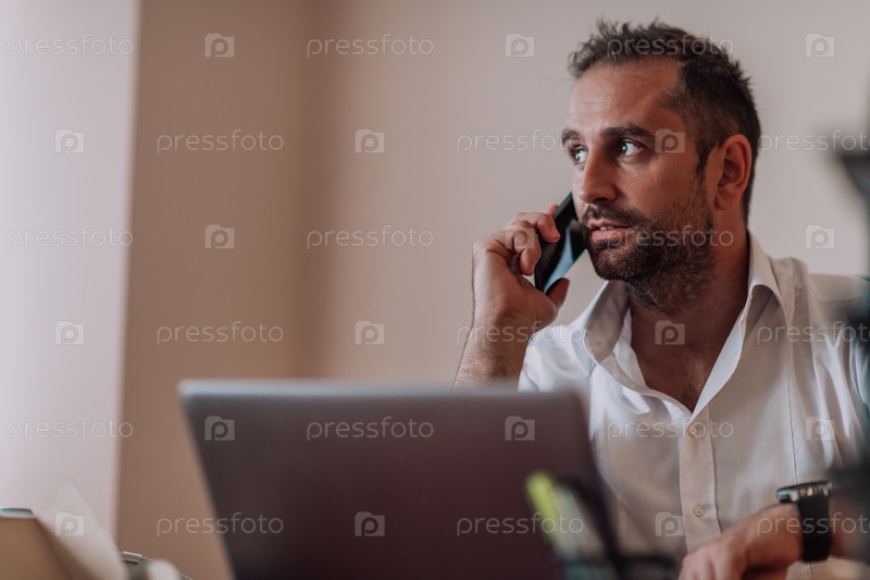 Бизнесмен разговаривает по смартфону, сидя в офисе, демонстрируя свое профессиональное поведение и активную коммуникацию