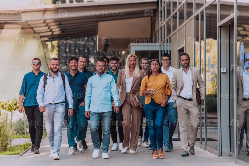 Группа бизнесменов и коллег из разных слоев общества прогуливается по своему рабочему месту, демонстрируя сотрудничество и командную работу в компании