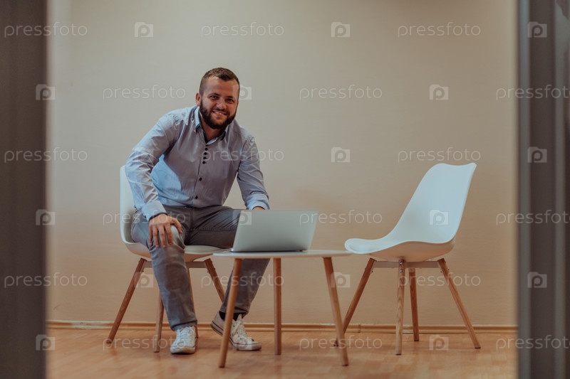 Уверенный в себе бизнесмен сидит и использует ноутбук с решительным выражением лица, а бежевый фон усиливает профессиональную атмосферу, демонстрируя его производительность и опыт