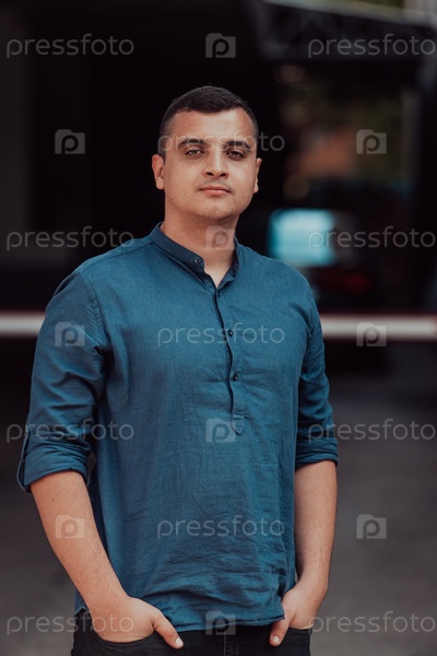 Портрет современного мужчины, излучающего уверенность и стиль, на фоне природы, демонстрирующий его харизму и модную манеру поведения