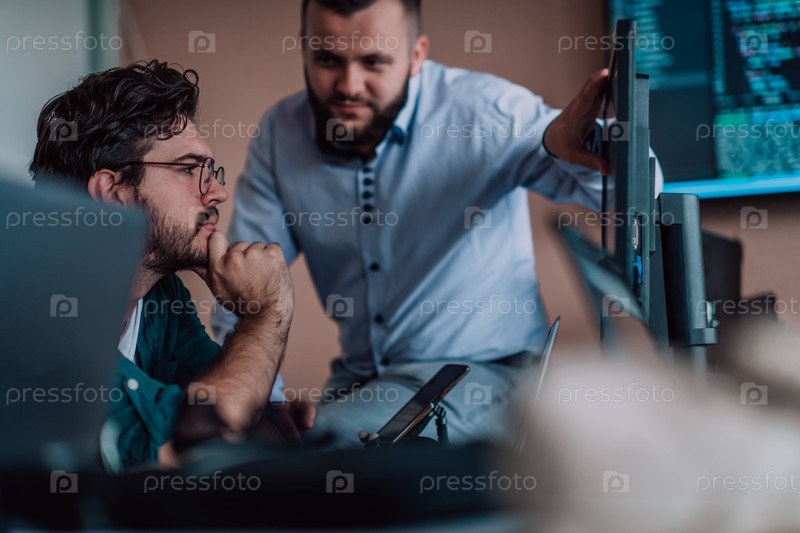 Программисты, погруженные в тесное сотрудничество, усердно трудятся вместе над решением сложных проблем и разработкой инновационных мобильных приложений с безупречной функциональностью