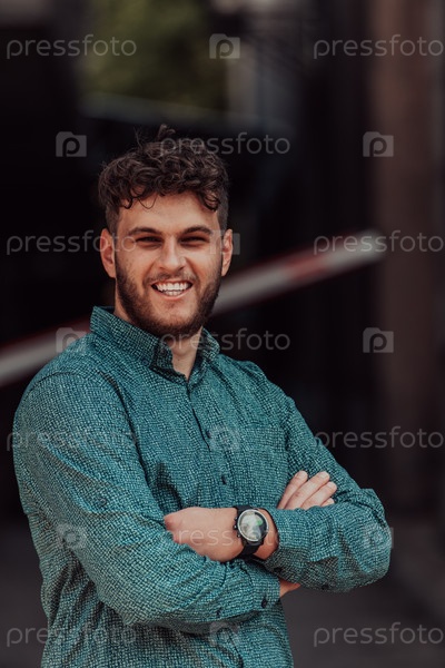Успешный молодой бизнесмен в рубашке, скрестив руки, позирует на открытом воздухе с уверенным выражением лица