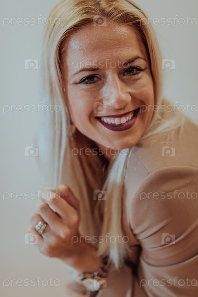Уверенная в себе и успешная бизнес-леди с широкой улыбкой позирует на бежевом фоне, излучая профессионализм и элегантность