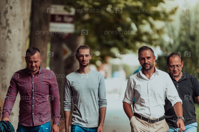 После продуктивного рабочего дня группа коллег из разных слоев общества наслаждается неторопливой прогулкой по современному и естественному городскому ландшафту