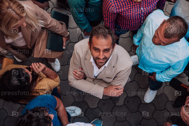 Фотография сверху группы бизнесменов и коллег, стоящих вместе и смотрящих в камеру, символизирующая единство и командную работу