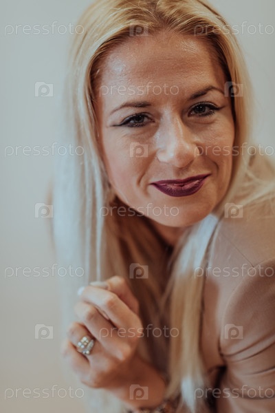 Уверенная в себе и успешная бизнес-леди с широкой улыбкой позирует на бежевом фоне, излучая профессионализм и элегантность