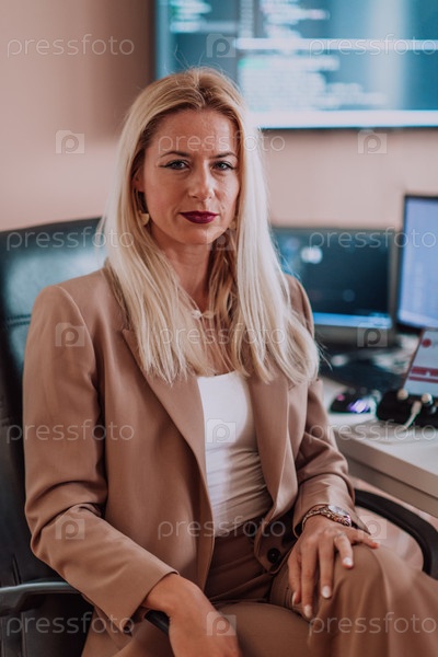 Бизнес-леди сидит в офисе программиста в окружении компьютеров, демонстрируя свою компетентность и преданность технологиям