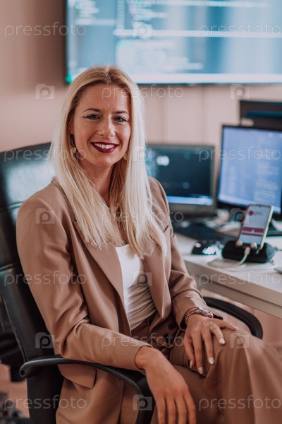 Бизнес-леди сидит в офисе программиста в окружении компьютеров, демонстрируя свою компетентность и преданность технологиям