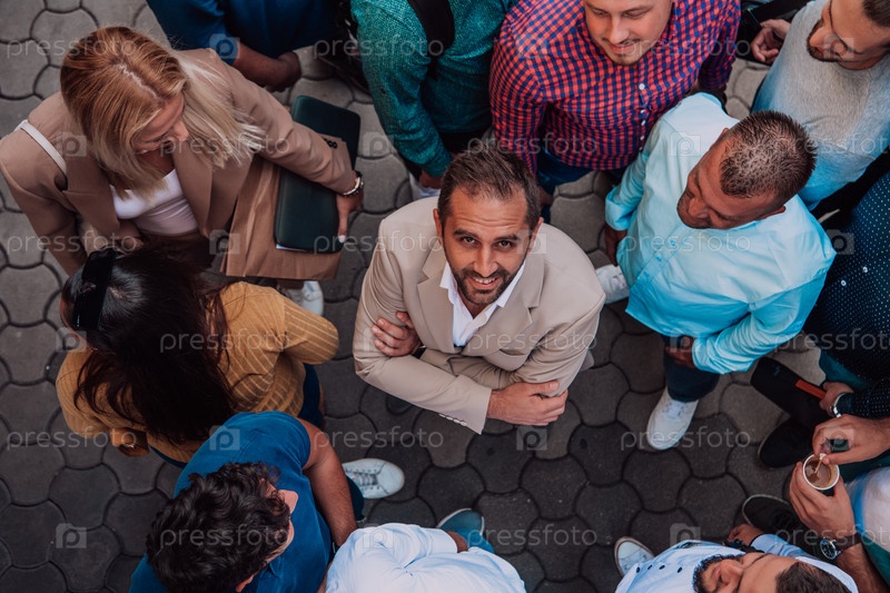 Фотография сверху группы бизнесменов и коллег, стоящих вместе и смотрящих в камеру, символизирующая единство и командную работу
