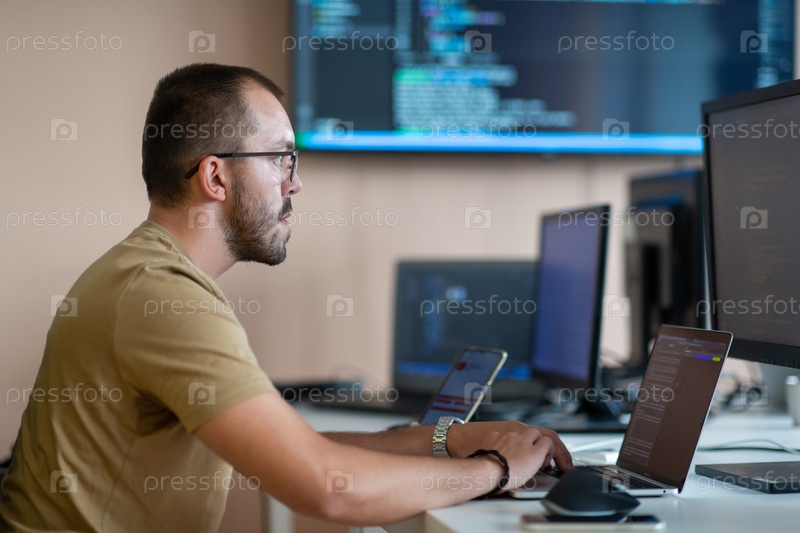 Программист усердно тестирует приложения для смартфонов, сидя в своем офисе