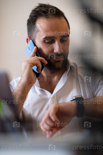 Бизнесмен разговаривает по смартфону, сидя в офисе, демонстрируя свое профессиональное поведение и активную коммуникацию