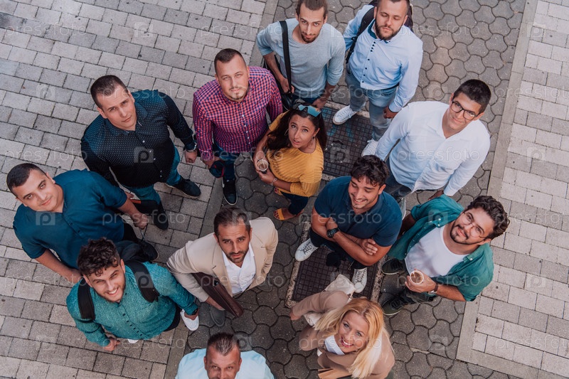 Фотография сверху группы бизнесменов и коллег, стоящих вместе и смотрящих в камеру, символизирующая единство и командную работу