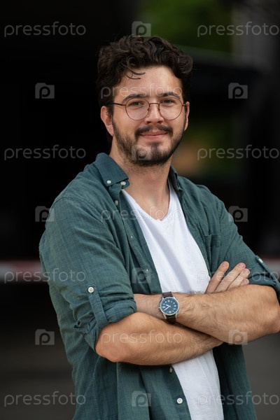 Успешный молодой бизнесмен в рубашке, скрестив руки, позирует на открытом воздухе с уверенным выражением лица