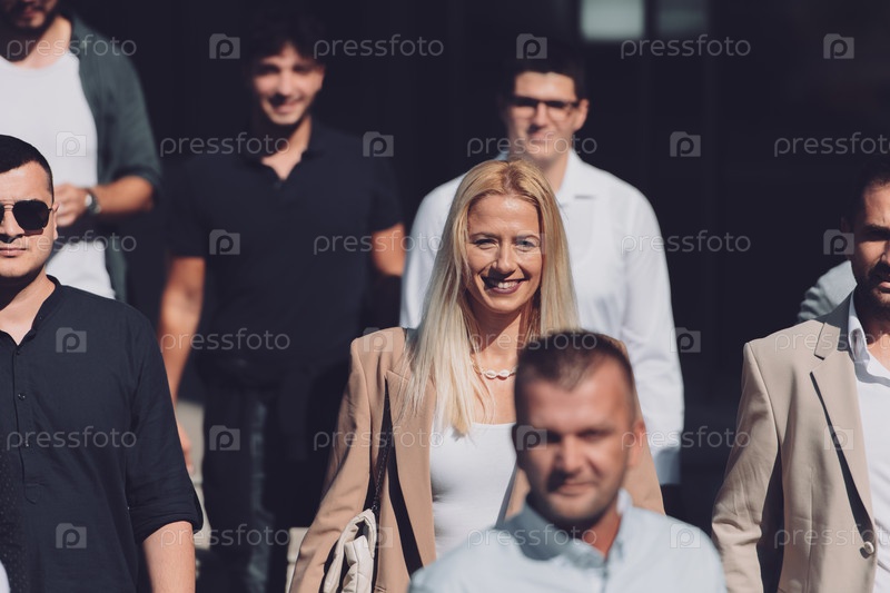 Группа бизнесменов и коллег из разных слоев общества прогуливается по своему рабочему месту, демонстрируя сотрудничество и командную работу в компании