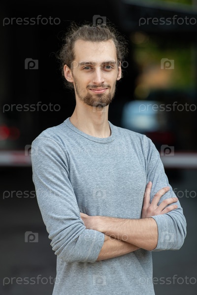Портрет молодого успешного бизнесмена со скрещенными руками перед компанией