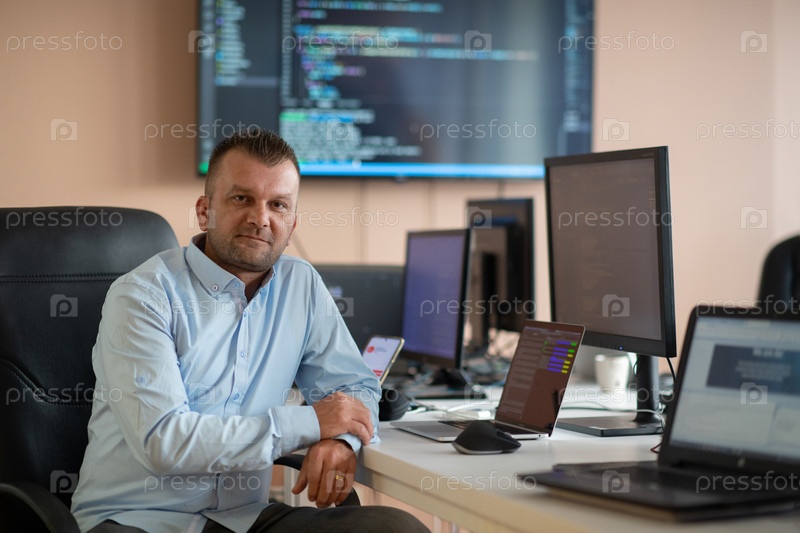 Программист усердно тестирует приложения для смартфонов, сидя в своем офисе