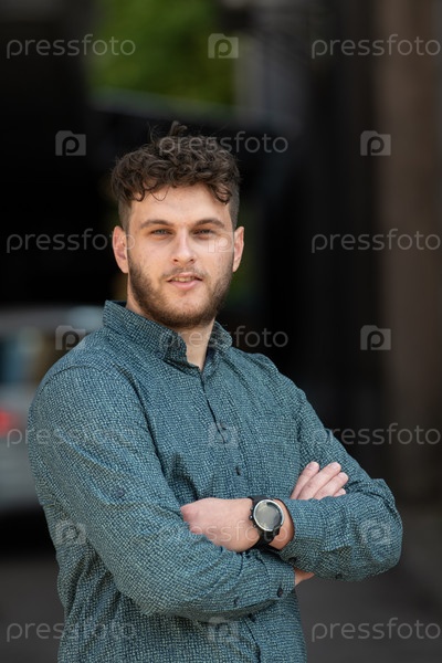 Успешный молодой бизнесмен в рубашке, скрестив руки, позирует на открытом воздухе с уверенным выражением лица