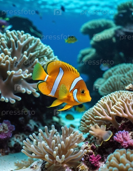 Яркие оранжево-бело-желто-синие-красные рифовые рыбы плавают через коралловый риф. Солнечные лучи проникают в морскую воду. Разнообразие животных. Экология гидросферы. Антропогенный фактор, влияющий на гибель коралловых рифов. AI