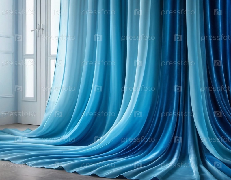 Занавес с мягкими плавными стекающими складками. Глубокий синий цвет и роскошная текстура создают драматическую и элегантную атмосферу. Декорация и дизайн интерьера. Дорогая занавес из богатой ткани. AI