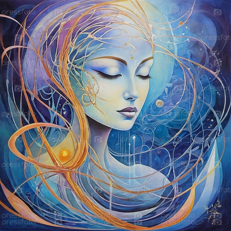 Женщина с закрытыми глазами мирно отдыхает среди закрученного вихря голубой и золотой энергии. Абстрактные линии исходят из ее головы и тела, создавая ощущение неземной красоты и духовной связи