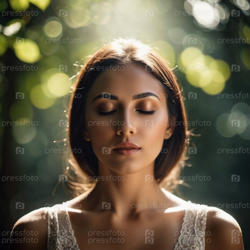 Женщина в зеленом лесу, купающаяся в солнечном свете, глубокая медитация. Исцеляющая энергия Рейки. Мягкий свет просачивается сквозь листья, создавая безмятежную успокаивающую атмосферу. Связь с природой Сила исцеляющей энергии
