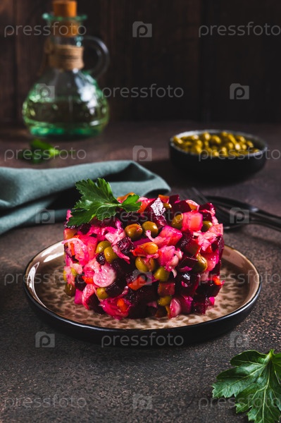 Традиционный салат из свеклы с отварными овощами и солеными огурцами на тарелке на столе вертикальный вид