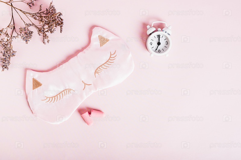 Концепция маски для сна от бессонницы, беруши и будильник на розовом фоне