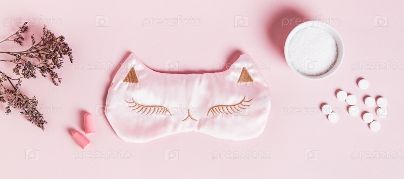 Концепция маски для сна от бессонницы, беруши, снотворное и порошок магния на розовом фоне