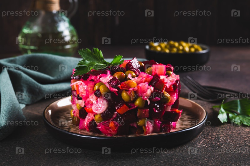 Традиционный салат из свеклы с отварными овощами и солеными огурцами на тарелке на столе