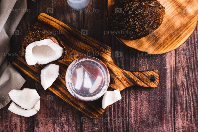 Свежая кокосовая вода в стакане и кусочки кокоса на столешнице