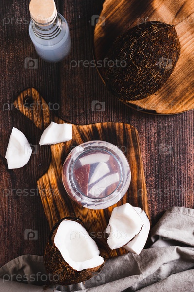 Стакан свежей здоровой кокосовой воды и кокосовой мякоти на столешнице и вертикальный вид