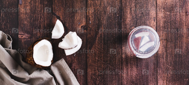 Стакан свежей здоровой кокосовой воды и кокосовой мякоти на столешнице веб-баннер
