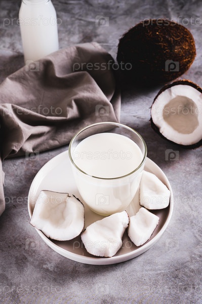 Стакан органического кокосового молока и кокосовой мякоти на столе, вертикальный вид