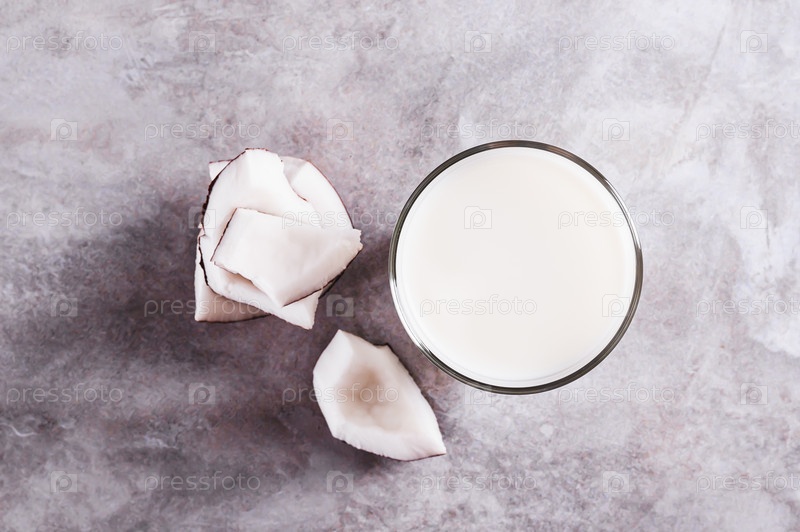 Крупный план свежего кокосового молока в стакане и кусочков кокоса на тарелке на столешнице