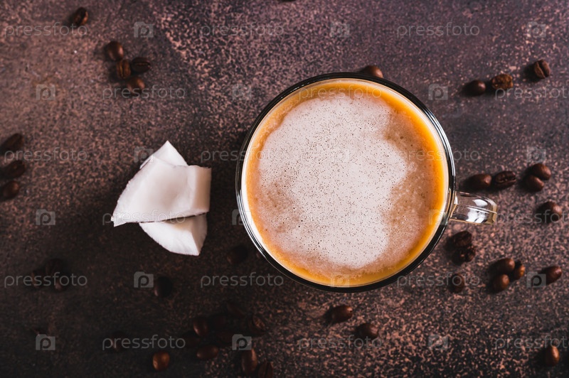 Крупный план вьетнамского кокосового кофе в чашке и кусочков кокоса на столешнице