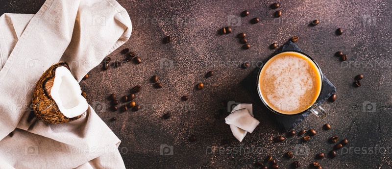 Чашка холодного кокосового кофе, кокосовая мякоть и кофейные зерна на столешнице веб-баннер