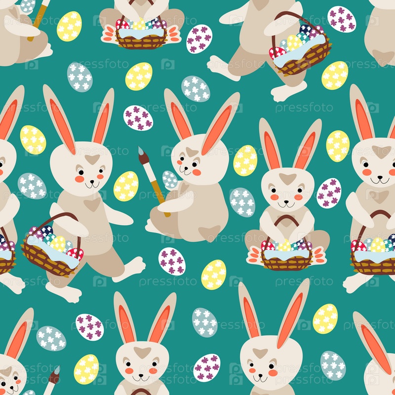 Пасхальные кролики с корзинками разноцветных яиц на зеленом фоне