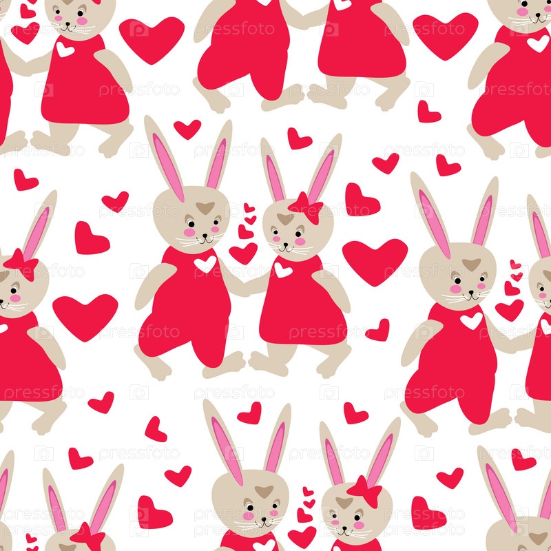 Мультяшные влюбленные кролики, зайцы среди сердец на белом фоне