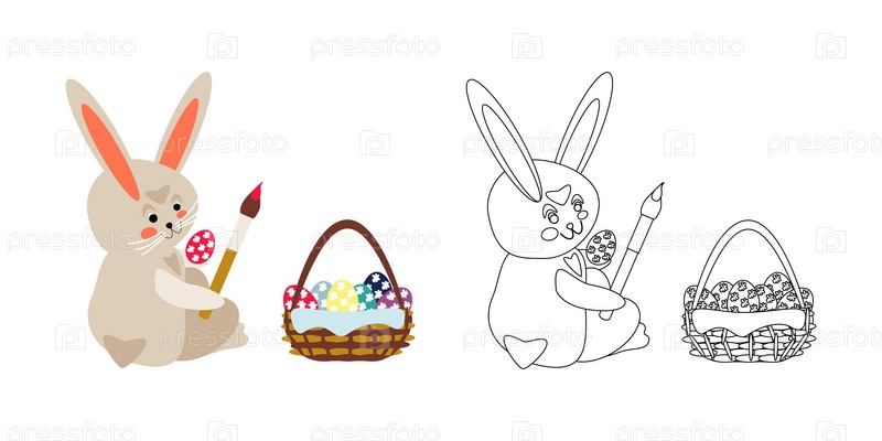 Раскраска мультяшный кролик с корзиной раскрашивает пасхальное яйцо