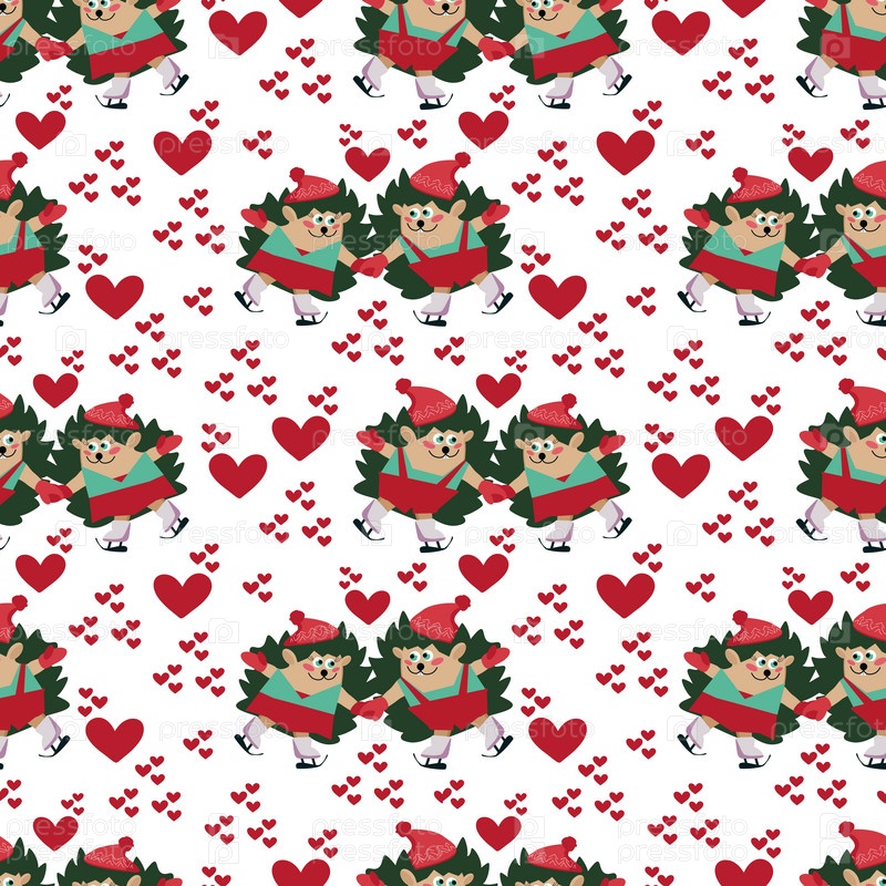 Мультяшные влюбленные ежики на коньках среди сердец на белом фоне