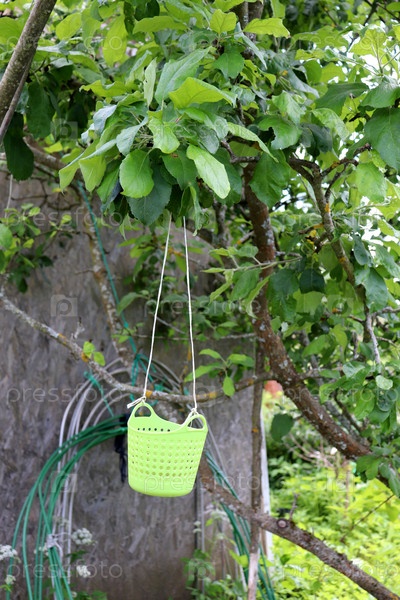 Пластиковая корзина с квасом для насекомых висит на ветке яблони