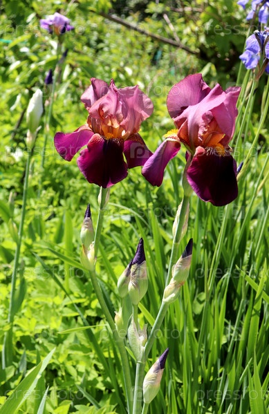Два розовых и фиолетовых цветка ириса на клумбе в солнечный день