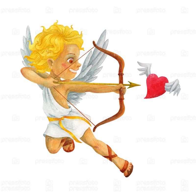 Херувим, амур, ангел любви целится стрелой в летящее сердце. Изолированный акварельный персонаж для Дня святого Валентина, свадьбы, юбилея, открыток, плакатов