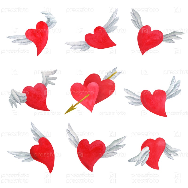 Летающие сердца в разных эмоциональных позах. Набор символов любви и Дня святого Валентина для поздравительных открыток, приглашений на вечеринку, подарочных бирок. Акварельная иллюстрация