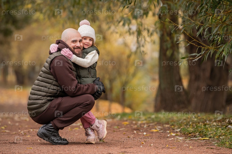 Маленькая дочь обнимает своего любящего отца во время прогулки в осеннем парке. День отца