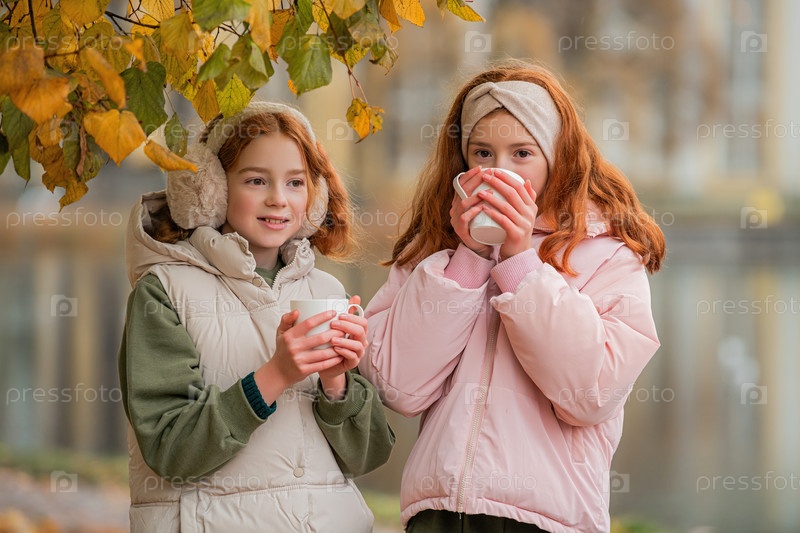 Семья согревается во время осенней прогулки теплым напитком из термоса. Погода тихая, мягкая и облачная